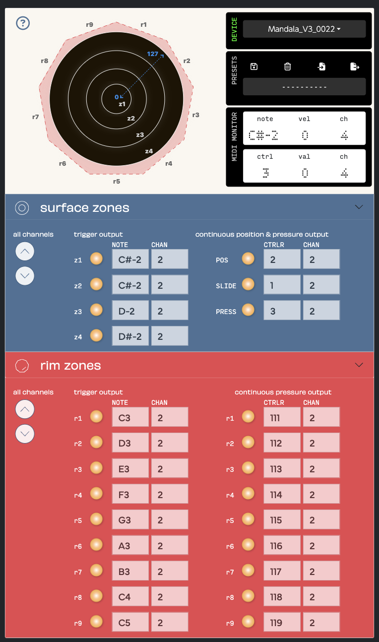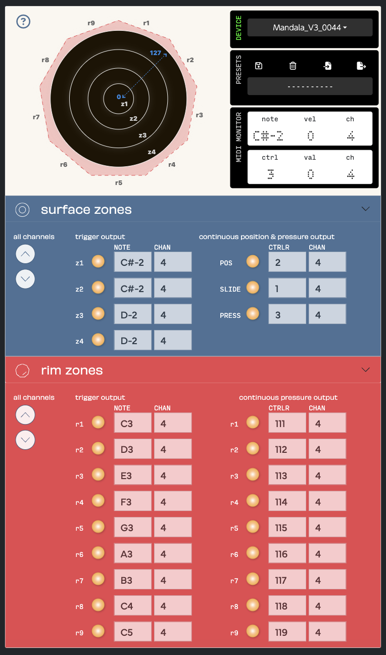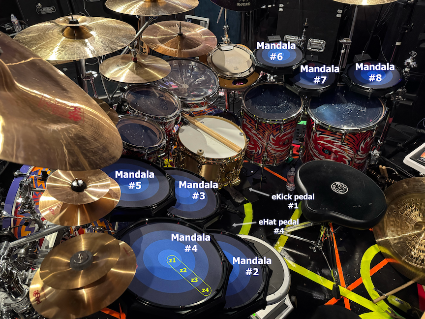 One small difference within Danny’s setup is that Mandala #4 also has z3 and z4 combined into one big zone. So, all in all, six of Danny’s pads are set to be three zone pads and one is set to be a two zone pad. At this time Danny only uses the surface trigger zones and surface position controller and none of the rim triggers or other controllers.