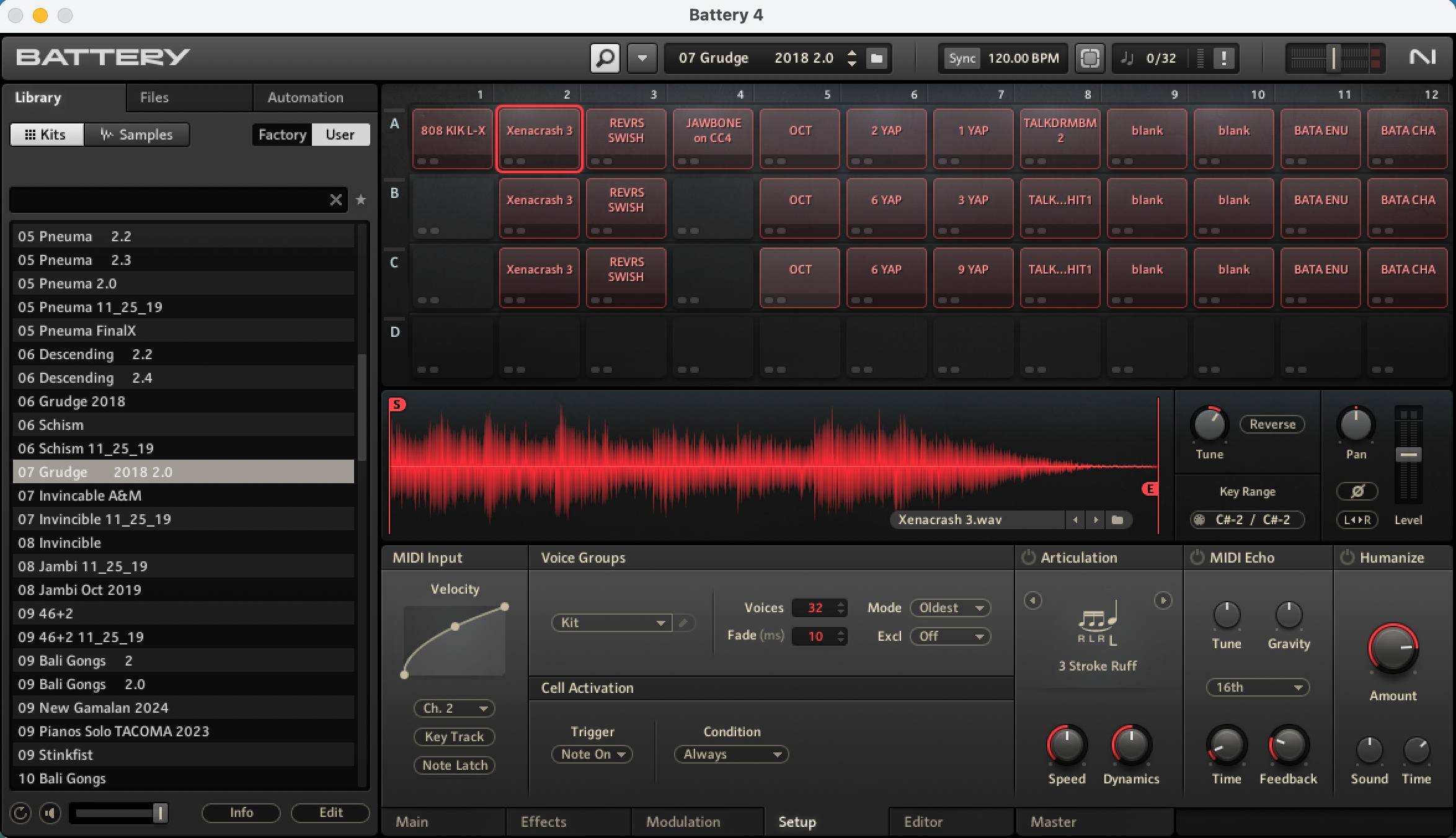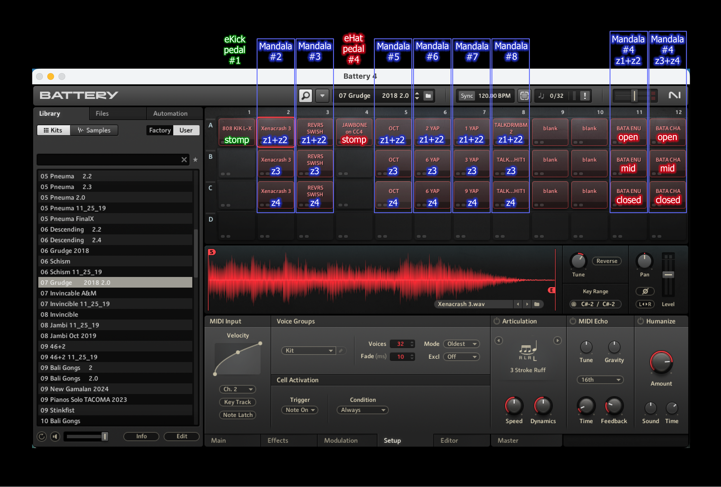You might be wondering what columns 11 and 12 are used for. We know that stomping on the eHat pedal triggers the sample in cell 4A, but what happens instead when the eHat pedal is in the open, mid, or closed position and Danny hits z1+z2 or z3+z4 on Mandala #4? That’s what columns 11 and 12 are for. The three rows of column 11 represent which cells will trigger when Danny hits z1+z2 on Mandala #4 while the eHat pedal is either open, mid, or closed. Similarly, the three rows of column 12 represent which cells will trigger when Danny hits z3+z4 on Mandala #4 while the eHat pedal is either open, mid, or closed. This functionality is carried out using the ‘On Controller’ condition within each of those cells. Each cell will trigger upon its ‘Key Range’ note being received as long as the controller signal from the eHat currently matches the specified ‘On Controller’ range for that cell (more ‘On Controller’ info available in the Battery User Manual). You can see above with cell 11A highlighted that it will trigger when it receives note C#-2 on MIDI channel 4 as long as the eHat pedal (CC #4) is outputting a 0 (meaning the pedal is in the open position). Danny’s pedal converter box outputs 0 when the eHat is open, 127 when it is closed, and 64 at any other position.