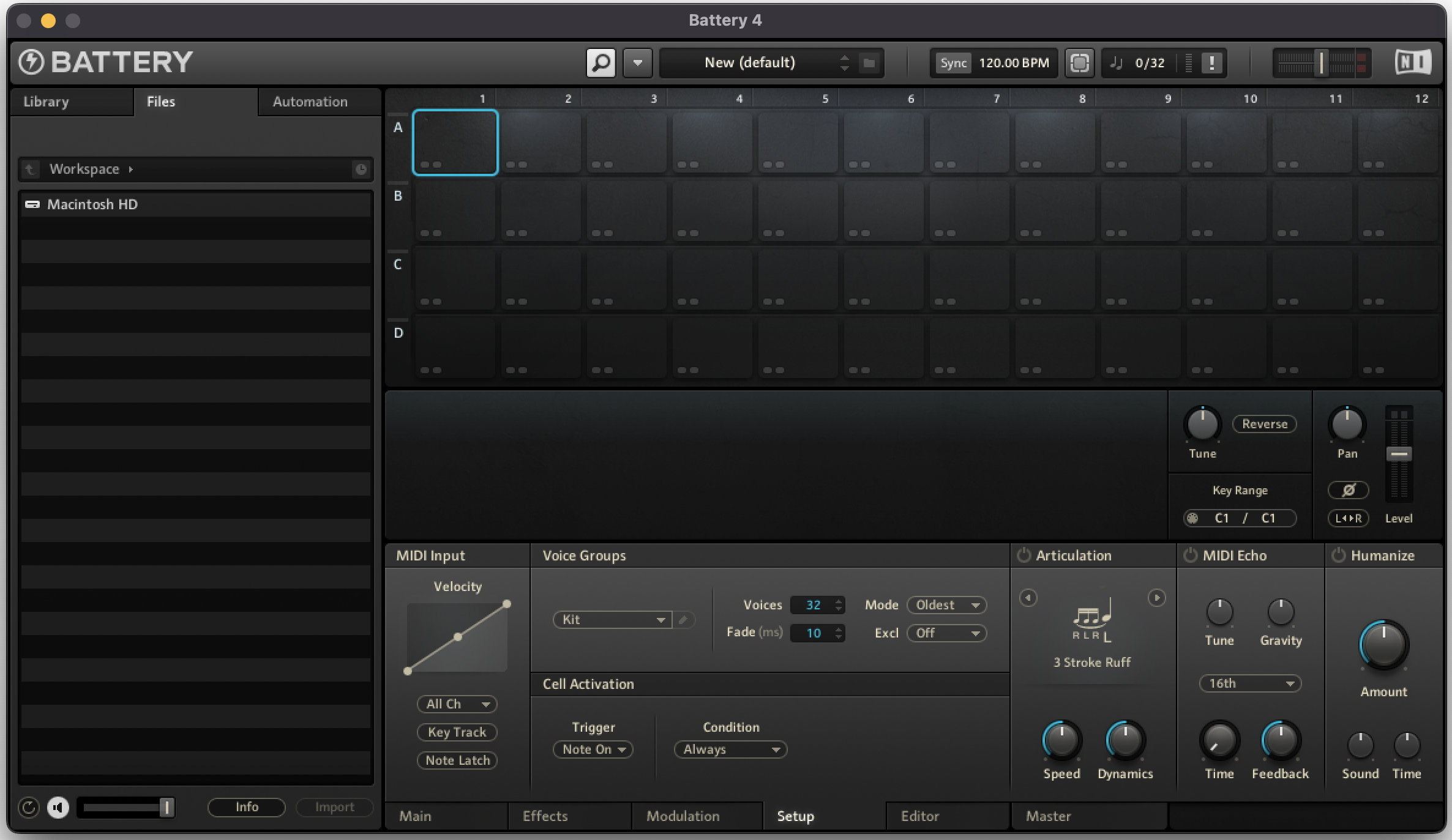 Next let’s cover the basics of Battery 4. Battery is a collection of cells in a grid pattern with columns and rows. Battery presets can have up to 16 columns (1-16) and up to 8 rows (A-H). Danny uses 12 columns and 4 rows for his presets. Each cell can have audio samples dropped into it and have associated information entered to set which MIDI notes (‘Key Range’) will trigger the cell and which MIDI channel (‘Ch.’ under MIDI Input) the cell is operating on. Above you can see the grid for one of Danny’s Battery presets before he adds any samples or setup information. Danny runs Battery 4 in standalone mode (as opposed to plugin mode within a DAW) which means under File>Audio and MIDI Settings... he’s got his Audio Driver settings configured and all of his Mandala pads turned ‘On’ as MIDI Inputs (NOT as MIDI Outputs).